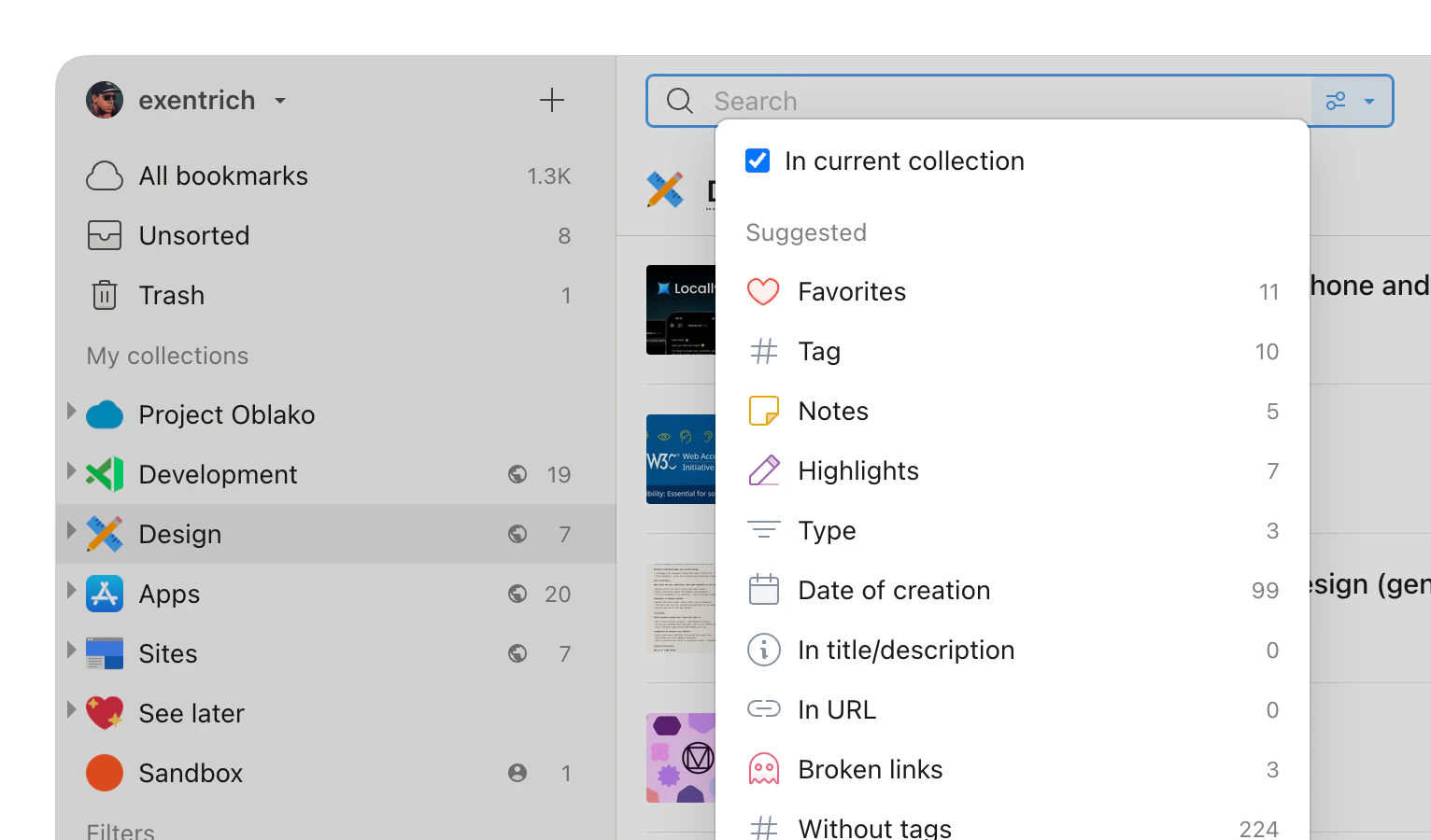 Filters live in the sidebar and apply across your entire library. Click any filter to apply it — the bookmark list updates instantly.