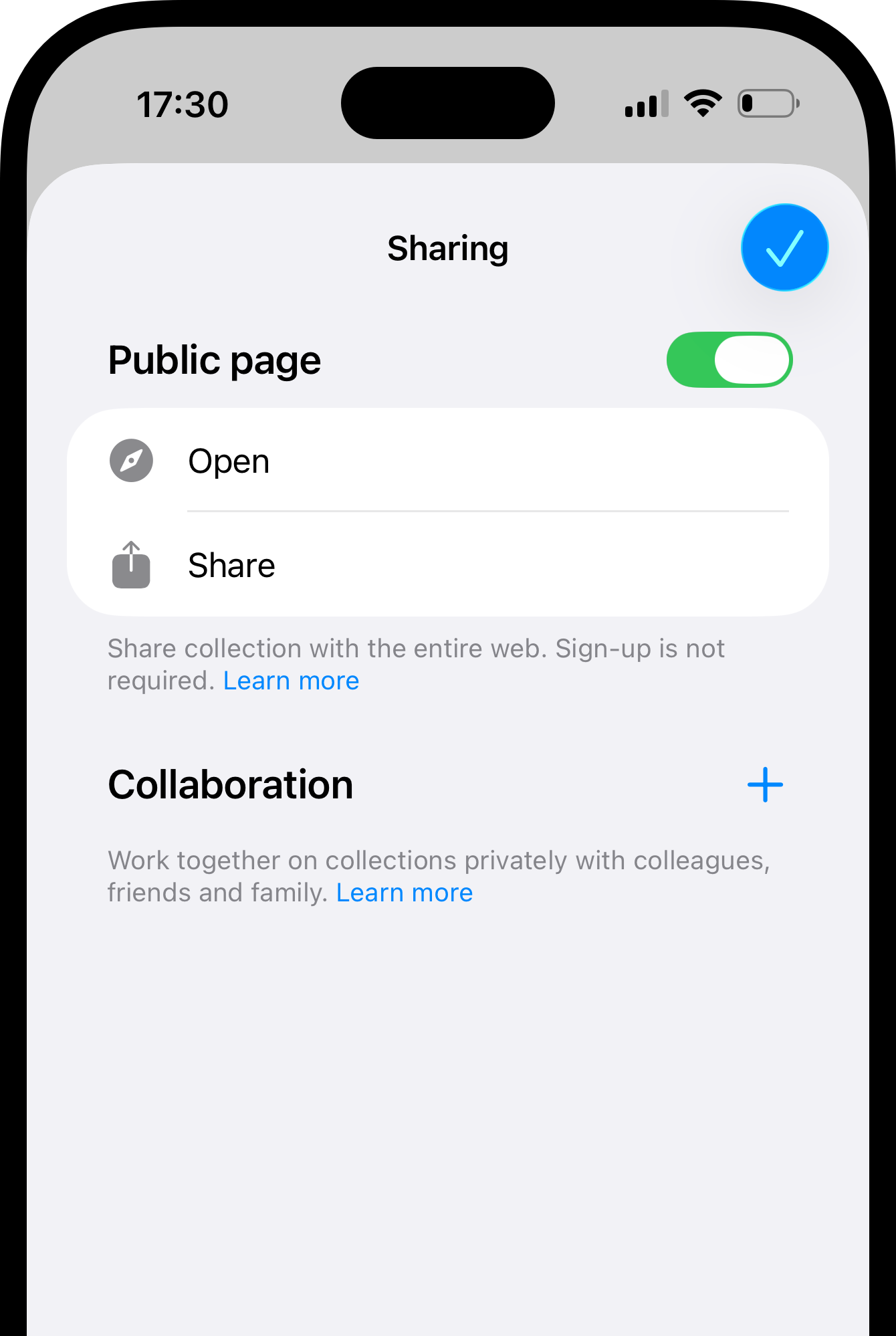 To take a collection off the web, go back to Share and turn off Public Page. The link stops working immediately. If it was your only public collection, your personal page atusername.raindrop.page becomes inaccessible too.
