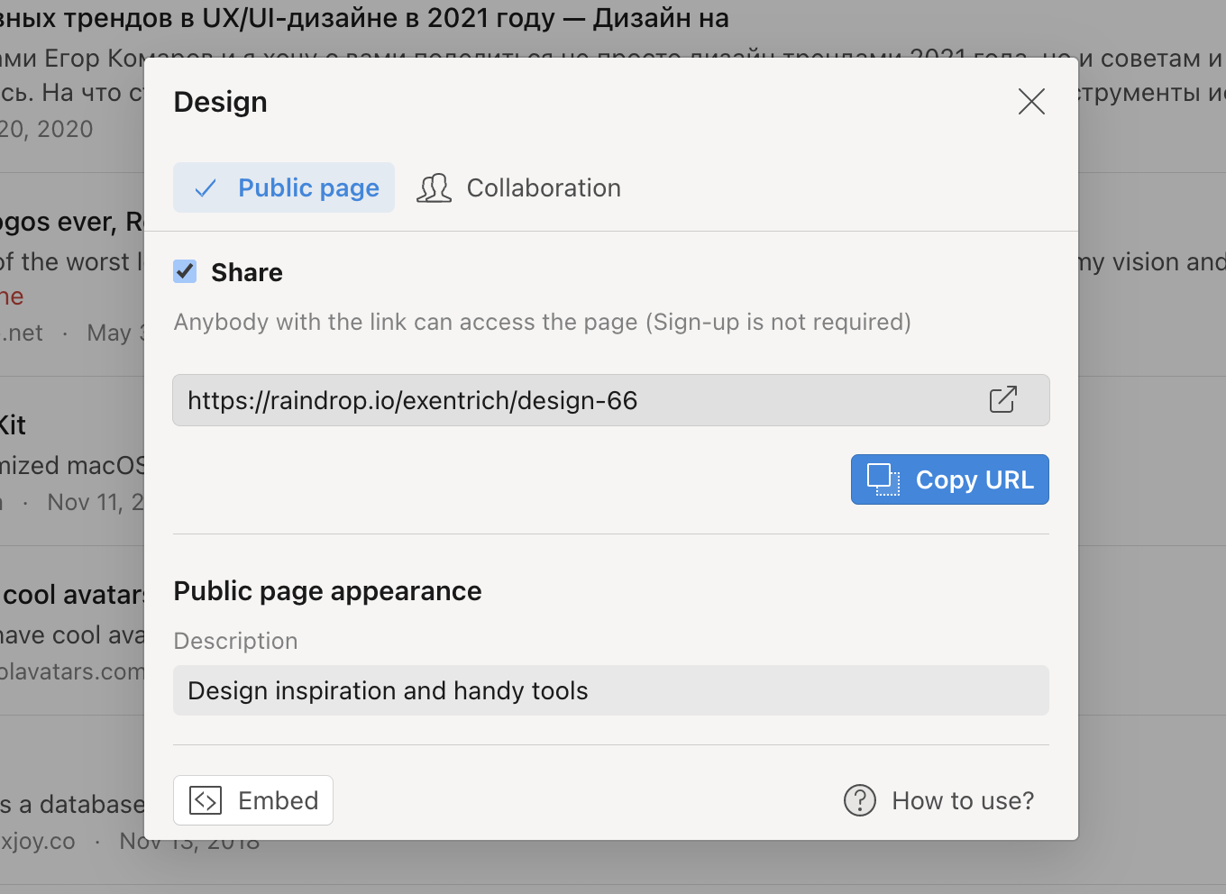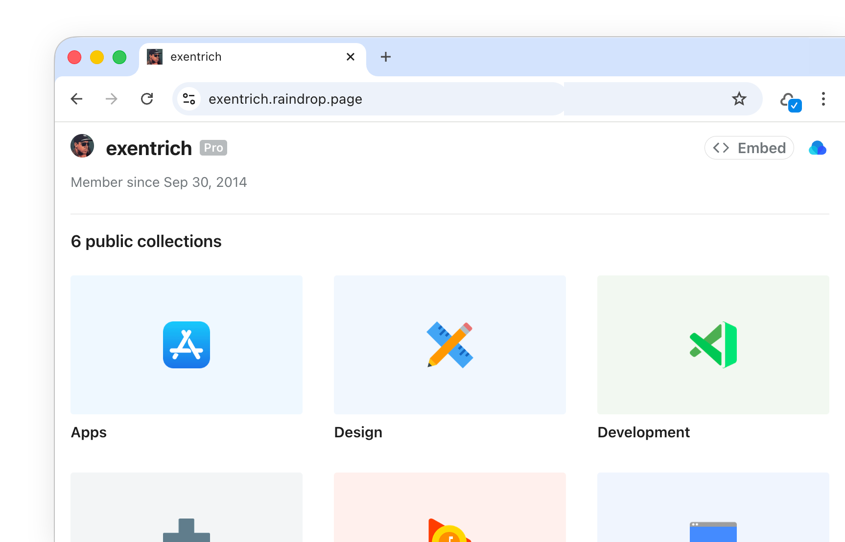 username.raindrop.pagebecomes accessible — it lists all your public collections in one place