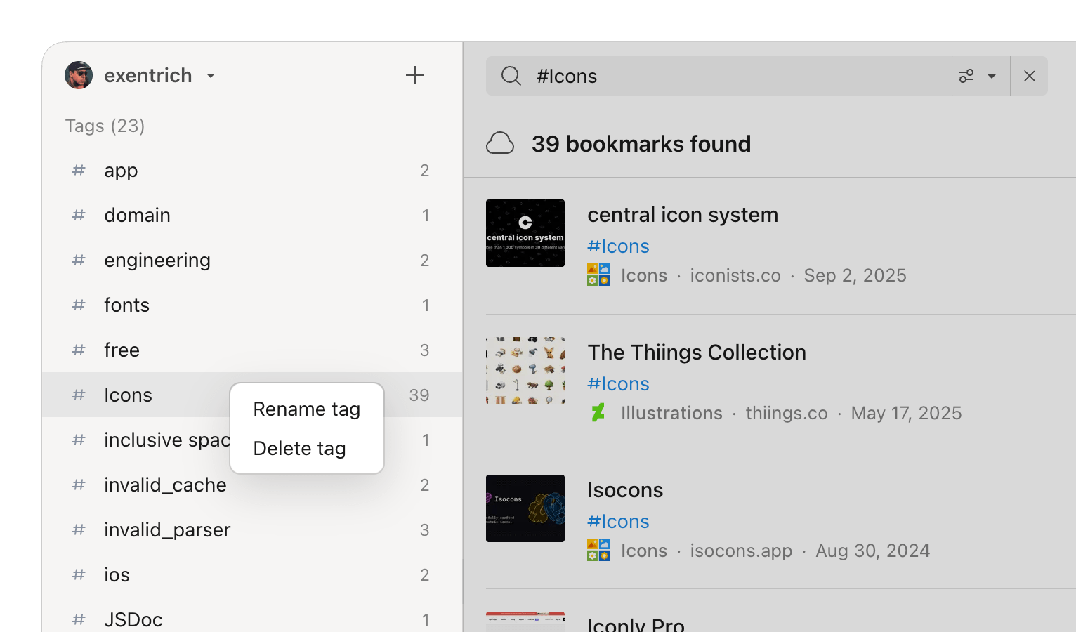 Rename or delete a tag itself — the change applies to every bookmark that uses it.- Web & Desktop
